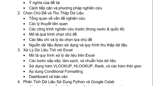 ...về bộ dữ liệu mà nhóm tìm được. Sau đó tìm kiếm các lý thuyết, các nghiên cứu trước đó (lịch sử nghiên cứu), các bài báo hoặc cái bài luận liên quan, để làm nền tảng cho việc phân tích các kết quả đạt được. Gợi ý thực hiện các yêu cầu sau: Tải file dử liệu lên drive, và kết nối được google drive với google colab. Chạy các lệnh đọc file bằng pandas , sau đó cho biết kích thức của bộ dữ liệu, ngoài ra kết hợp với SciPy , Numpy để xử lý dữ liệu nếu cần. Mô tả các trường dữ liệu. Nếu trường nào là số, thì thống kê mô tả sơ bộ cho các trường đó. Sau đó nhận xét. Vẽ biểu đồ phân bố cho các biến / cột dữ liệu, nhận xét. Vẽ các biểu đồ bằng seaborn , trong đó phải có nhiều loại biểu đồ khác nhau, càng nhiều càng tốt. Sau đó, nhận xét cho các biểu đồ này. Từ việc nhận xét dữ liệu, hãy rút ra được tính chất của dữ liệu, kết luận về nó. Liên hệ thực tế, các nghiên cứu trước, các lý thuyết trước. Phần 5 – Hoàn thành và viết báo cáo Gợi ý kết cấu bài tiểu luận như sau: Lời mở đầu Danh sách nhóm và phân chia công việc Mục Lục Giới Thiệu Lý do chọn đề tài Mục tiêu của tiểu luận Phạm vi của nghiên cứu Ý nghĩa của đề tài Cách tiếp cận và phương pháp nghiên cứu Chọn Chủ Đề và Thu Thập Dữ Liệu Tổng quan về vấn đề nghiên cứu Các lý thuyết liên quan Các công trình nghiên cứu trước (trong nước & quốc tế) Mô tả quá trình chọn chủ đề Các tiêu chí và lý do chọn lựa chủ đề Nguồn dữ liệu được sử dụng và quy trình thu thập dữ liệu Xử Lý Dữ Liệu Thô với Excel Mô tả quy trình xử lý dữ liệu trên Excel Các bước sắp xếp, làm sạch, và chuẩn hóa dữ liệu Sử dụng hàm VLOOKUP, HLOOKUP, Rank, và các hàm thời gian Áp dụng Conditional Formatting Dashboard và báo cáo Phân Tích Dữ Liệu Sử Dụng Python và Google Colab Các bước chuyển dữ liệu sang định dạng .csv hoặc .xls Phân tích tính chất dữ liệu sử dụng Python Các kỹ thuật và thư viện Python được sử dụng (ví dụ: pandas, numpy, matplotlib, seaborn) Kết Quả và Thảo Luận Mô tả kết quả phân tích dữ liệu Thảo luận về ý nghĩa và tầm quan trọng của kết quả So sánh với lý thuyết và nghiên cứu trước đó Kết Luận và Đề Xuất Tổng kết các phát hiện chính từ nghiên cứu Đề xuất cho các nghiên cứu tiếp theo và ứng dụng thực tế Hạn chế của nghiên cứu và cơ hội cải thiện Phụ Lục : Chứa bất kỳ thông tin bổ sung hoặc tài liệu tham khảo Tài Liệu Tham Khảo: Danh sách các nguồn dữ liệu, bài báo, và tài liệu nghiên cứu đã sử dụng (khoảng từ 15 tài liệu tham khảo trở lên ) ( Hết )