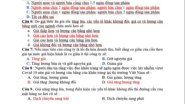 Câu 1 : Câu nào sau đây thuộc về kinh tế học vi mô: Tốc độ tăng trưởng kinh tế của Việt Nam năm 20 20 là 2,9 % Tốc độ tăng trưởng kinh tế của Hoa kỳ năm 2020 là -3,5 % Giá của một số loại xe ô tô ở Việt Nam giảm mạnh năm 20 21 . Tỷ lệ thất nghiệp ở Việt Nam có xu hướng giảm dần trong các năm qua Dùng các số liệu sau để làm cho các câu từ 2 đến 5 Hàm cung và hàm cầu của sản phẩm X cho ở bảng số liệu sau đây: Câu 2 Hàm cung và hàm cầu của SP X lần lượt là : A. Qd = 35 – 5P; Qs = -10 + 10P B. Qd = 45 – 5P; Qs = -20 + 10P C. Qd = 35 – 2P; Qs = -16 + 5P D. Tất cả đều sai Câu 3 Nếu Chính phủ định mức giá P = 2 thì tình hình thị trường sẽ : A. Thị trường cân bằng và hết hàng B. Thừa hàng và lượng hàng thừa là 30 C. Thiếu hàng và lượng hàng thiếu là 15 D. Tất cả đều sai Câu 4 : Khi Chính phủ đánh thuế theo sản lượng với mức thuế t = 3 ( ngàn đồng / sản phẩm ) thì mức giá và sản lượng cân bằng mới sẽ là : A. P = 5; Q = 10 B. P = 7; Q = 60 C. P = 6; Q =50 D. Tất cả đều sai Câu 5 : Khi Chính phủ đánh thuế theo sản lượng với mức thuế t = 3 ( ngàn đồng / sản phẩm ) thì mức thuế mà mỗi bên sẽ chịu là : A. Người mua và người bán cùng chịu 1,5 ngàn đồng / sản phẩm B. Người mua chịu 2 ngàn đồng / sản phẩm ; người bán chịu 1 ngàn đồng / sản phẩm C. Người mua chịu 1 ngàn đồng / sản phẩm ; người bán chịu 2 ngàn đồng / sản phẩm D. Tất cả đều sai Câu 6 : Do giá thức ăn gia súc tăng lên , các yếu tố khác không đổi , giá cả và lượng cân bằng mới của ngành chăn nuôi heo sẽ : Giá thấp hơn và lượng cân bằng nhỏ hơn Giá cao hơn và lượng cân bằng nhỏ hơn Giá cao
