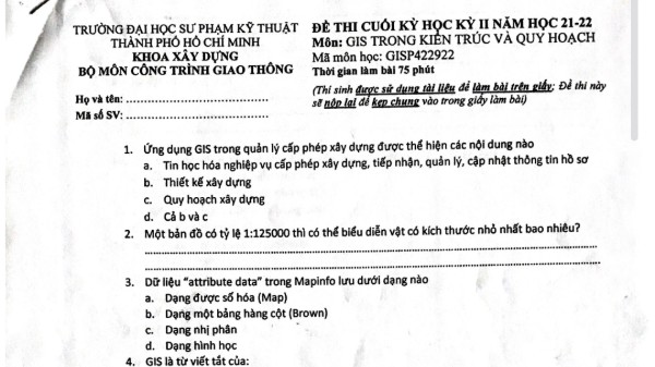 2021-2022 HK2 Đề Thi và đáp án môn Gis trong kiến trúc và quy hoạch